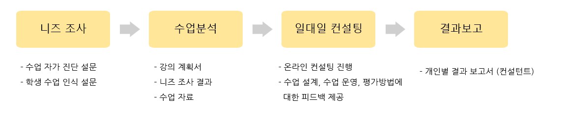 2025년 11월말~12월 말까지 전북소재 원광대학교 교수진을 대상으로 혁신교수법 적용을 위한 수업컨설팅을 진행하였습니다.기존의 수업 영상 분석 방식이 아니라, 개인별 교수법 개선에 대한 니즈 파악과 다음 학기 적용하고자 하는 혁신 교수법(AI적용/ 플립러닝/ PBL/ PjBL/ 디자인씽킹)의 적용에 대한 컨설팅 중심으로 진행되었습니다. 현재 수업뿐만 아니라 다음 학기 적용하고자 하는 교수법에 대한 장애요인을 확인하고 제거하기 위한 솔루션을 제공하는 것 중심으로 컨설팅이 진행되어 높은 만족감을 이끌어 냈습니다.수업 영상이 없는 관계로, 사전에 수업 자기진단 설문과 수강생의 수업 인식 설문조사를 면밀하게 진행하고, 강의계획서와 수업 자료를 면밀히 검토한 후 컨설팅이 진행되었습니다.일대일 컨설팅에서는 현재의 교수법 개선을 위한 기법과 혁신교수법 적용을 위한 프로세스와 준비사항에 대한 높은 관심을 보여주었습니다. 특히, 일대일 컨설팅 진행시 제공한 솔루션 중 AI 수업 활용 전략에 대한 만족감이 매우 높았습니다. <컨설팅 문의>T. 070-7699-3788e-mail. kskim@learningmotive.comKakao. https://open.kakao.com/o/sKk3PVff